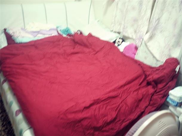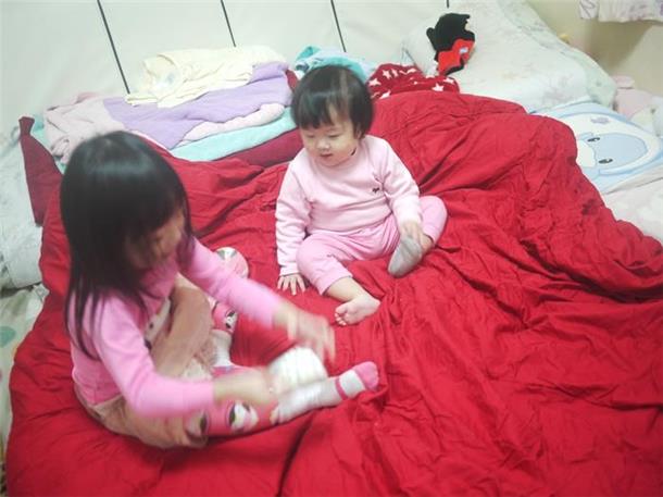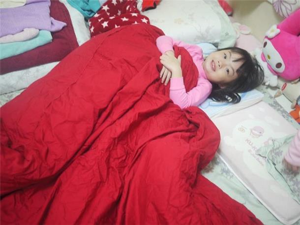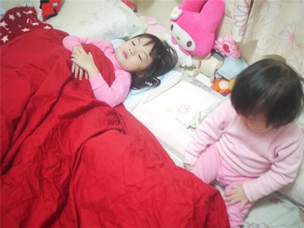 兩個公主搶著蓋新被子,哈哈,媽咪我一喊睡覺,姊姊立刻鑽進被子卡位。